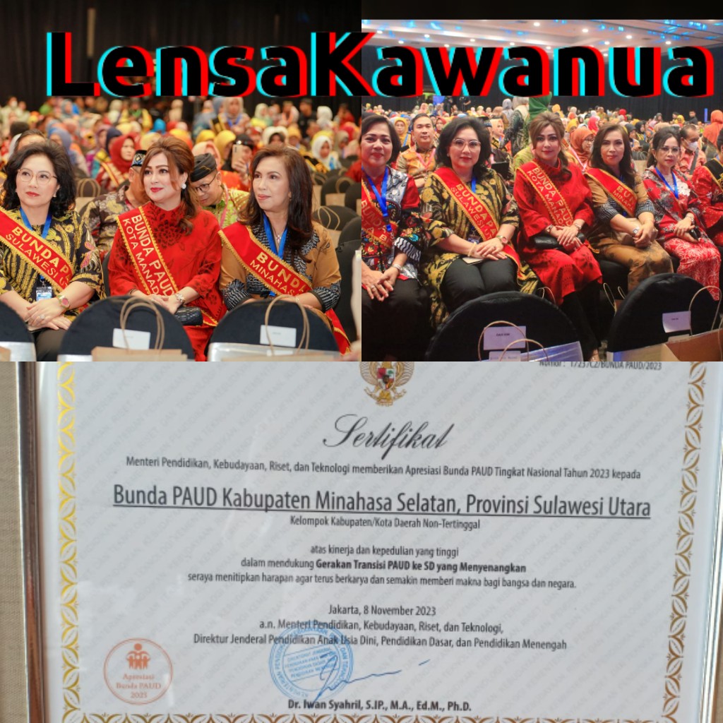 #Lensa Kawanua- Bunda PAUD Minahasa Selatan Ny. Elsje Rosje Wongkar-Sumual yang juga Selaku Ketua TP – PKK Kabupaten Minahasa Selatan Menerima Apresiasi Bunda PAUD Tingkat Nasional Tahun 2023 Kategori Kelompok Kabupaten/Kota Daerah Non-Tertinggal dari Menteri Pendidikan, Kebudayaan, Riset, dan Teknologi RI atas kinerja dan kepedulian yang tinggi dalam mendukung Gerakan Transisi PAUD ke SD yang Menyenangkan.