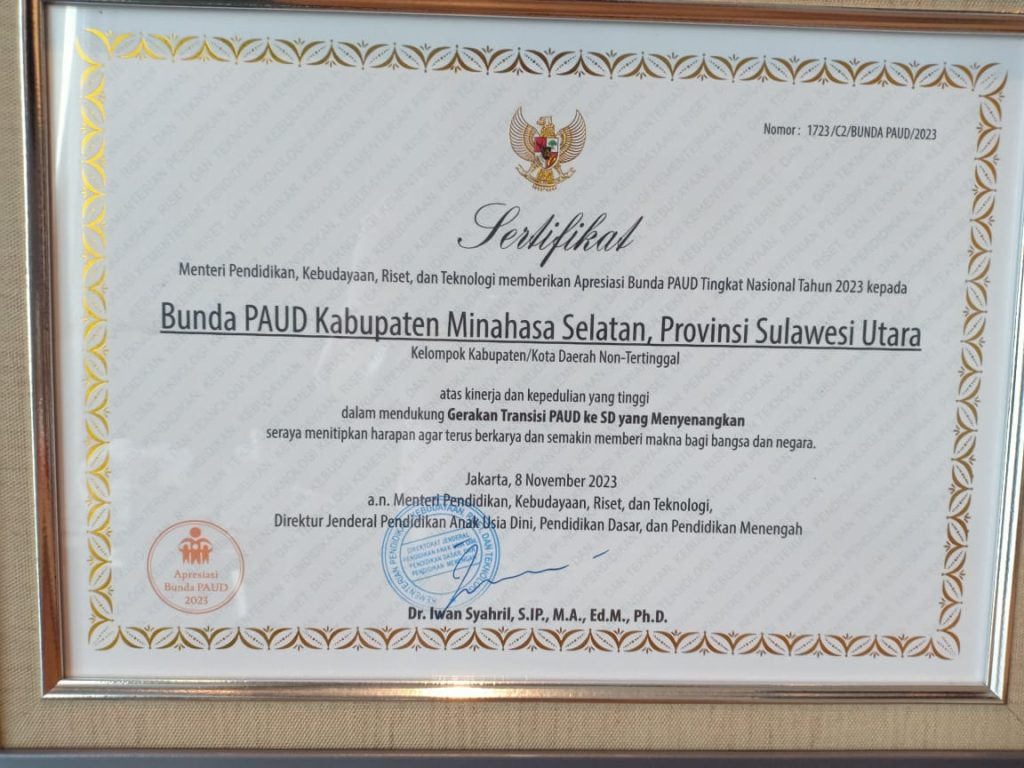 Apresiasi Bunda PAUD Tingkat Nasional Tahun 2023 diterima saat Bunda PAUD Kabupaten Minahasa Selatan Ny. Elsje Rosje Wongkar-Sumual Menghadiri Pembukaan Apresiasi Bunda PAUD Nasional tahun 2023 yang juga turut dihadiri Kepala Dinas Pendidikan dan Kebudayaan Arthur D. Tumipa, M.Ed,. bertempat di Mercure Convention Centre Ancol Jakarta.