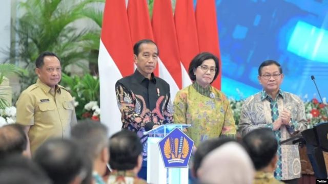 Presiden Joko Widodo didampingi Menteri Keuangan RI Sri Mulyani, pada acara penyerahan secara digital Daftar Isian Pelaksanaan Anggaran (DIPA) dan Buku Daftar Alokasi Transfer ke Daerah (TKD) tahun 2024 di Istana Negara, 29 November 2023. (Twitter/@jokowi)