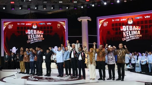 Tiga pasang capres-cawapres mengikuti debat kelima atau debat terakhir di Jakarta, hari Minggu (4/2). Courtesy : TPN Prabowo-Gibran