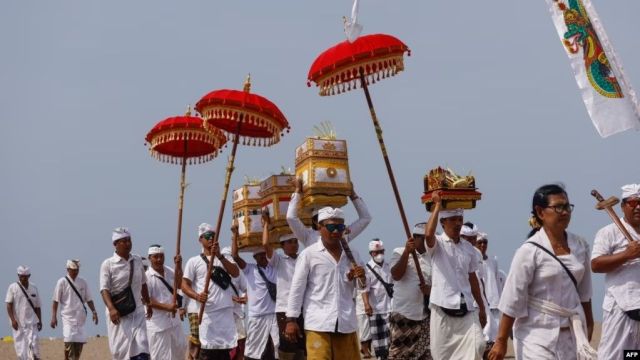 VOA Indonesia – Anggota komunitas Hindu kembali dari upacara di pantai di distrik Kerobokan, Bali, 3 Januari 2024. (David GANNON / AFP)