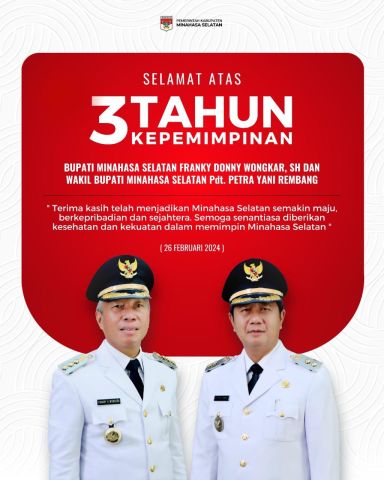 #LensaKawanua.com (Minahasa Selatan) -Tanggal 26 Februari 2024 genap 3 tahun kepemimpinan Franky Donny Wongkar dan Petra Yani Rembang sebagai Bupati dan Wakil Bupati di Kabupaten Minahasa Selatan.