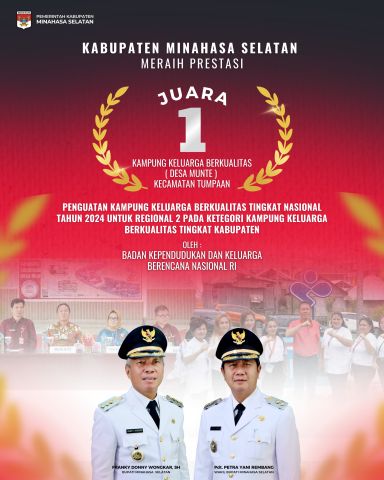 Informasi bahwa Pemerintah Kabupaten Minahasa Selatan dalam hal ini Bupati Minahasa Selatan bersama dengan Hukum Tua atau Ketua Pokja Kampung Keluarga Berkualitas, akan menerima Penghargaan/Apresiasi tersebut, yang direncanakan akan dilaksanakan pada pada peringatan Hari Keluarga Nasional Tahun 2024 di Kota Semarang, Jawa Tengah, tanggal 26 dan 27 Juni 2024 nanti.