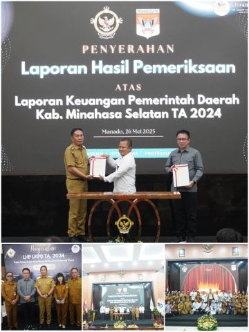 Opini Wajar Tanpa Pengecualian (WTP) yang ke-9 Atas Laporan Keuangan Pemerintah Daerah Tahun Anggaran 2024 tersebut diterima oleh Bupati Minahasa Selatan Franky Donny Wongkar, SH., pada Senin 26 Mei 2025 dalam kegiatan Penyerahan Hasil Pemeriksaan Atas Laporan Keuangan Pemerintah Daeah Tahun Anggaran 2024 Kabupaten/Kota di Provinsi Sulawesi Utara, bertempat di Kantor BPK RI Perwakilan Provinsi Sulawesi Utara, Manado.