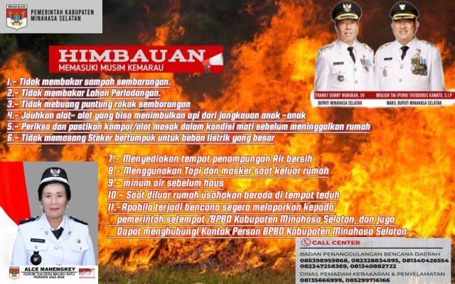 11.-Apabila terjadi bencana segera melaporkan kepada pemerintah setempat /BPBD Kabupaten Minahasa Selatan, dan juga Dapat menghubungi Kontak Person BPBD Kabupaten Minahasa Selatan 085398959868, 082328834895, 081340426554, 082347258369, 081340882722.